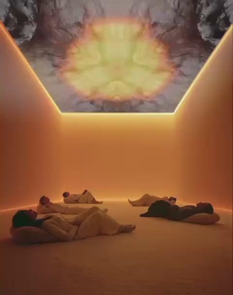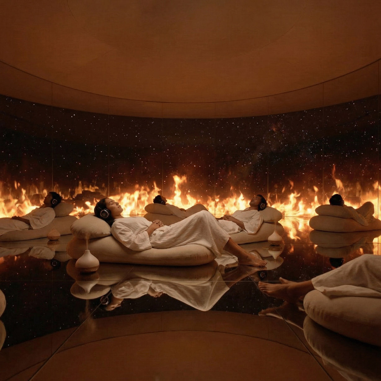 An immersive sensory environment offering guided stillness, elemental visuals, soundscapes, gentle aroma, and a supportive space for the body to fully relax.